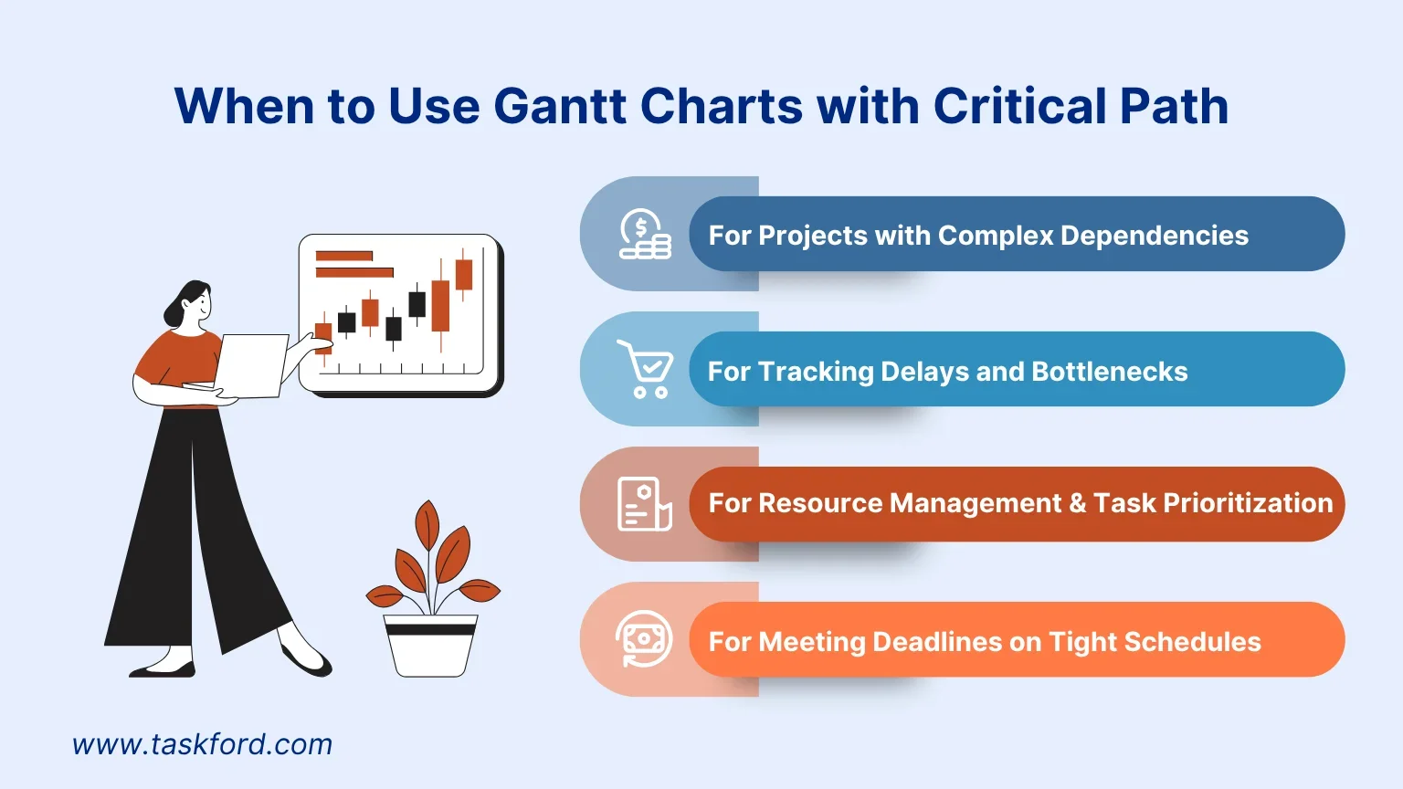 多くのタスクが相互依存している場合、どのタスクが全体の進行に影響を与えるかを把握することが重要です。 ガントチャートとCPMを組み合わせることで、期限厳守が必要なタスクを特定し、依存関係を可視化することで、クリティカルな作業と余裕のある作業を明確に区別できます。