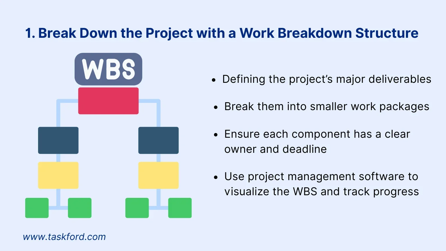**WBS(Work Breakdown Structure)**は、大規模プロジェクトを管理しやすい要素に分解するための重要な手法です。プロジェクトを階層的に小さなタスクへ分解することで、責任の割り当て、進捗追跡、スコープ管理が容易になります。
