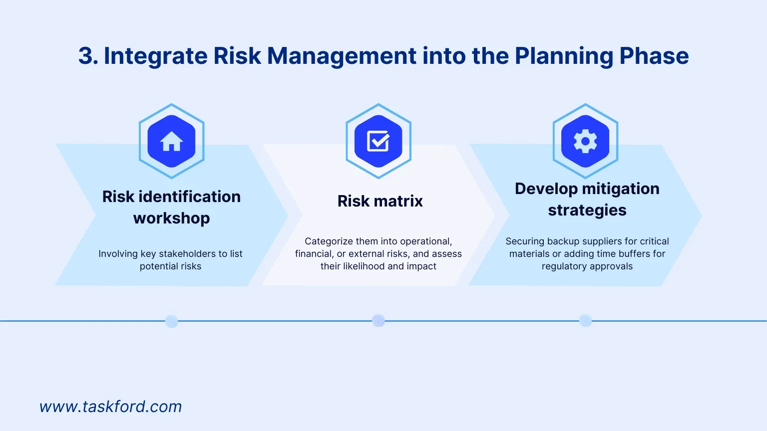 大規模プロジェクトにおけるリスク管理は、規制変更やサプライチェーン寸断などの不確実性に備えるうえで不可欠です。計画段階で統合することで、回復力を高め、意外性を最小化できます。