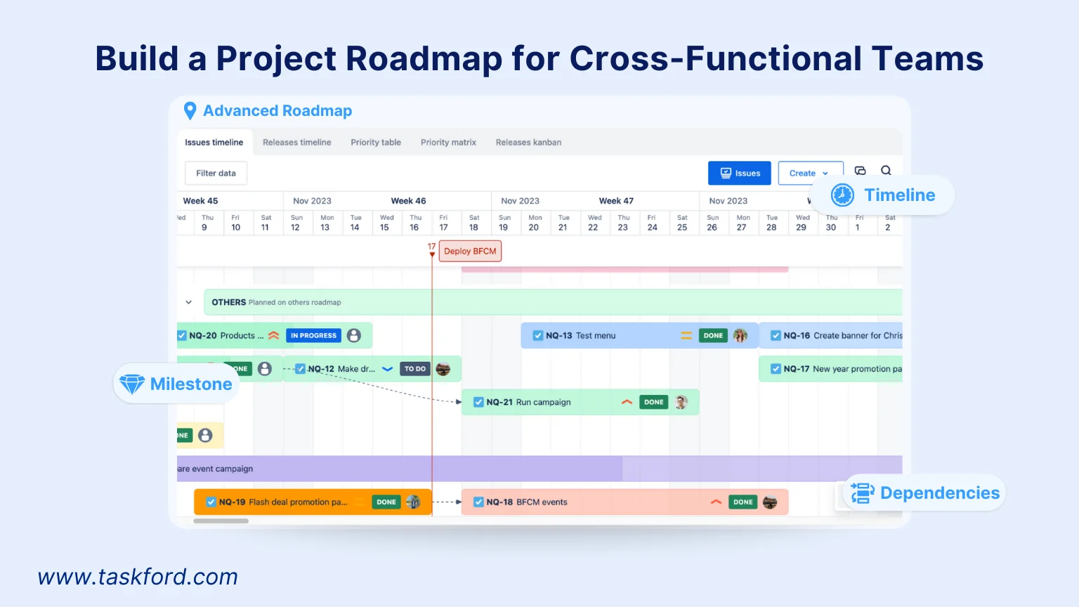 クロスファンクショナルプロジェクトの多くは、依存関係の見落としが原因で停滞します。 たとえば「マーケティングのローンチはエンジニアリングのリリースに依存」といった関係を明確にします。