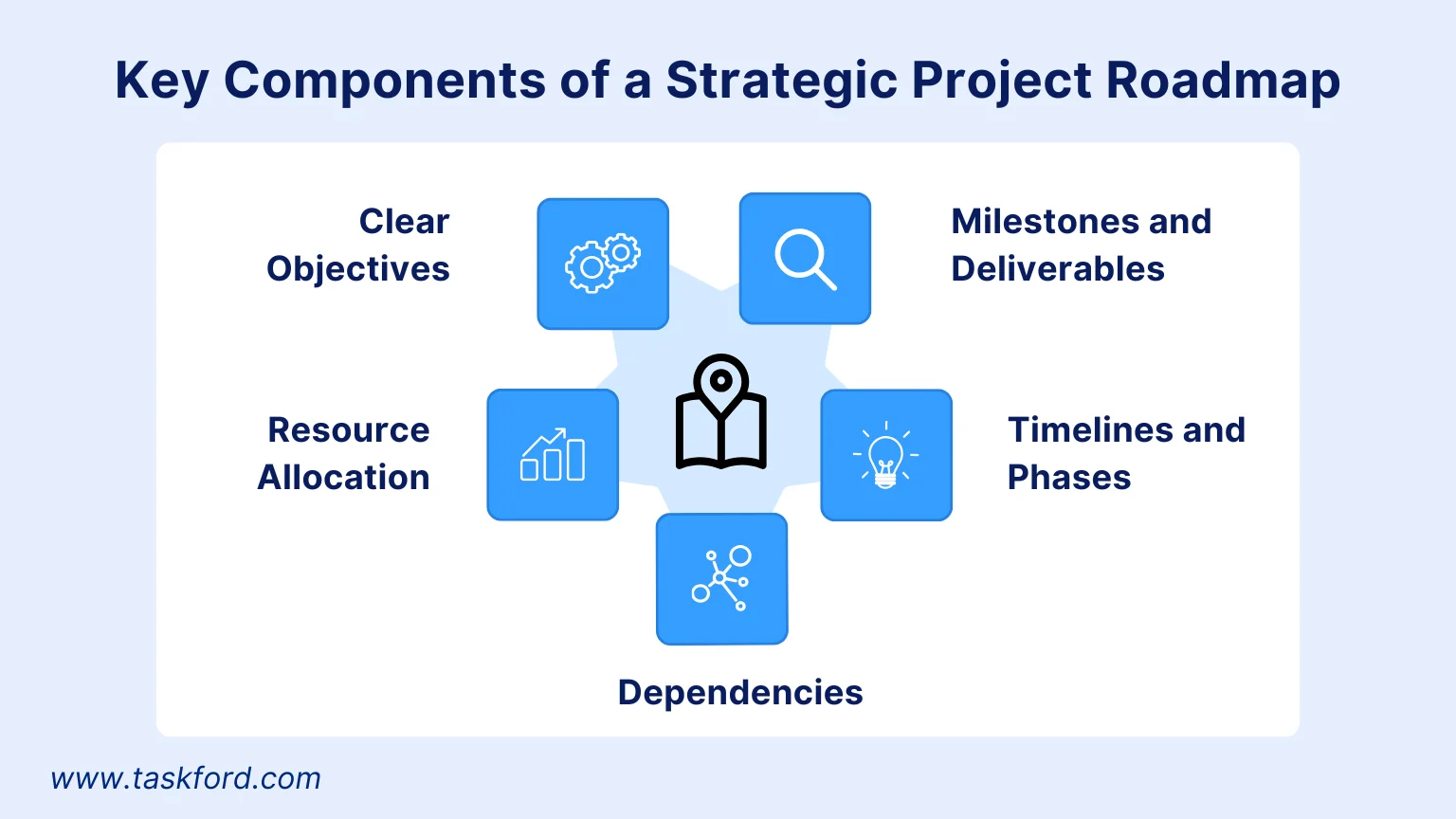 成功するプロジェクトロードマップには、クロスファンクショナルな連携を支えるいくつかの中核要素が含まれています。 以下の要素を明確に設計することで、ロードマップは包括的でありながら理解しやすいものとなります。
