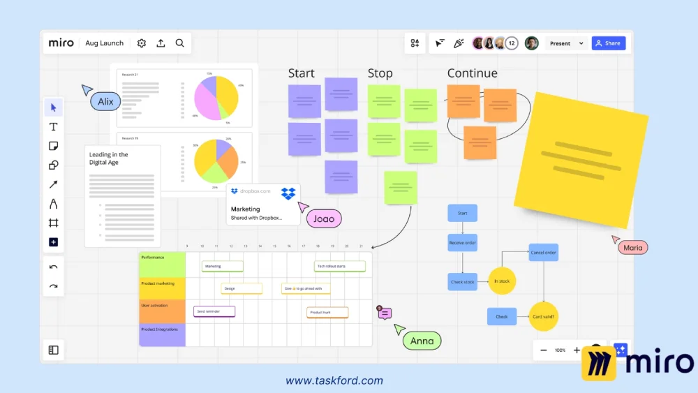 Miroは、オンラインホワイトボードを中心としたビジュアルコラボレーションツールです。 ブレインストーミング、ユーザージャーニー設計、ワークフロー可視化などに優れており、軽量なタスク管理機能も備えています。