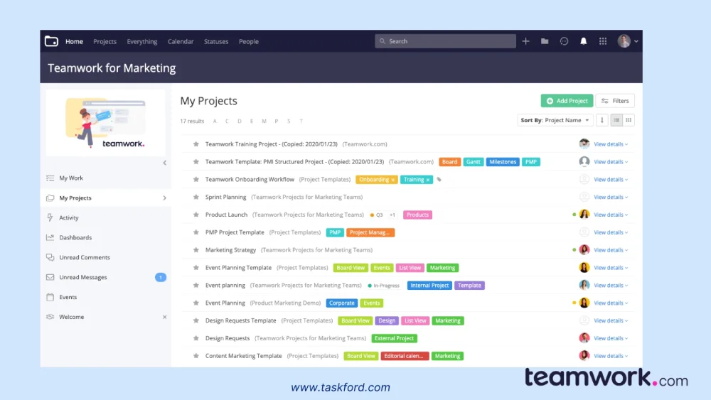 Teamwork.comは、クライアントワークやエージェンシー向けに最適化されたプロジェクト管理プラットフォームです。 タスク管理、タイムトラッキング、請求管理を一体化し、クライアントとのコラボレーションもサポートします。